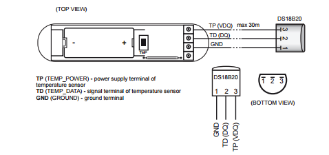 The DS18B20 temperature sensor may be installed anywhere where temperature readouts are necessary. If adequately protected, the DS18B20 sensor may be installed in humid conditions, under water, sealed in concrete or placed under the floor. CAUTION Connecting devices and sensors other than DS18B20 is not allowed. !