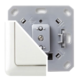 The insert is designed to fit into standard circular European wall boxes with 60 mm diameter. The insert combined with the mounting plate can be screwed in top of the wall box using the two screws delivered with the device. The mounting frame is then attached to the mounting plate and the switch is completed by pushing the switching paddle into the mounting frame. Mind the arrow on the inserts top side showing the mounting direction of the insert. It is also possible to mount the insert without any local operation behind a cover or inside a lamp. The mounting plate, frame and the switching paddle become useless in such a scenario.