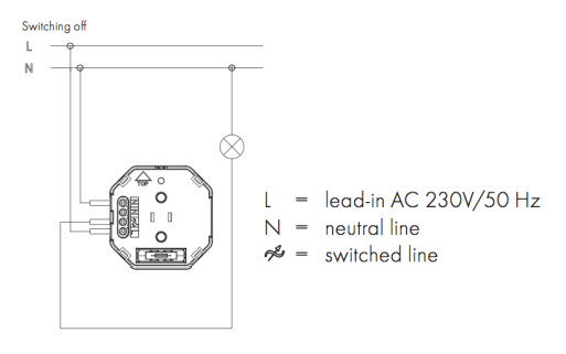 The schematics below shows how to wire the actuator. The two wired from the mains distribution panel are connected to the inserts contacts N and L. The contact S is the switched contact and need to be connected to the cable to the load. The second wire to the load is connected to N as well. Both contacts marked as N are connected with each other.