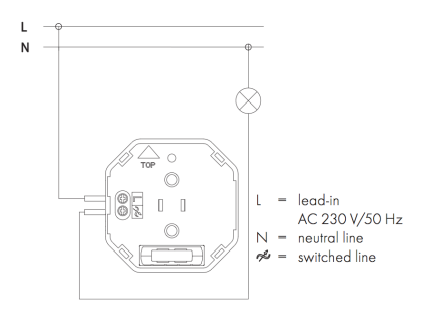 The schematics below shows how to wire the actuator. The hot wired from the mains distribution panel is connected to the inserts contacts L. The contact S is the switched contact and need to be connected to the cable to the load. The cable from the load is connected to neutral N. If there are both neutral and hot wire in the wall box the neutral from the mains panel and the neutral to the lamp need to be connected. It is not harmful if the two connections L and S are mismatched on the actuator.