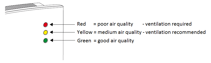 The SENSOAIR measures the carbon dioxide concentration (CO2) of the ambient air. The measured air qualitiy is shown with the LED lights.