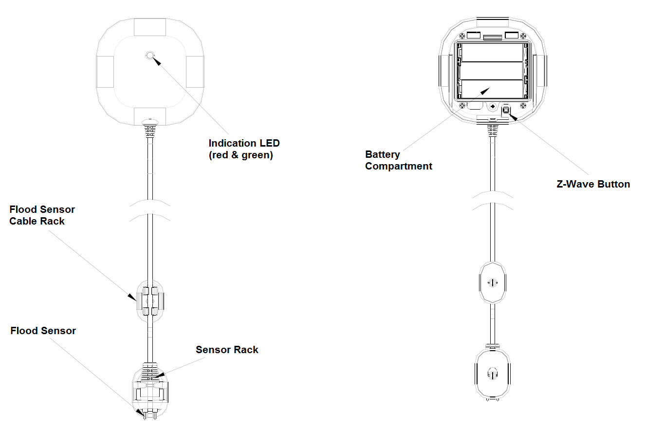 A clean smooth surface is required to mount the Flood Detector securely. The length of flood sensor cable is 3 meters. If a 3-meter cable is too long, roll up the cable and fasten it by twist ties. The transceiver should be placed as high up as possible on the wall to improve communication and to prevent it from coming into contact with water in case of flooding.