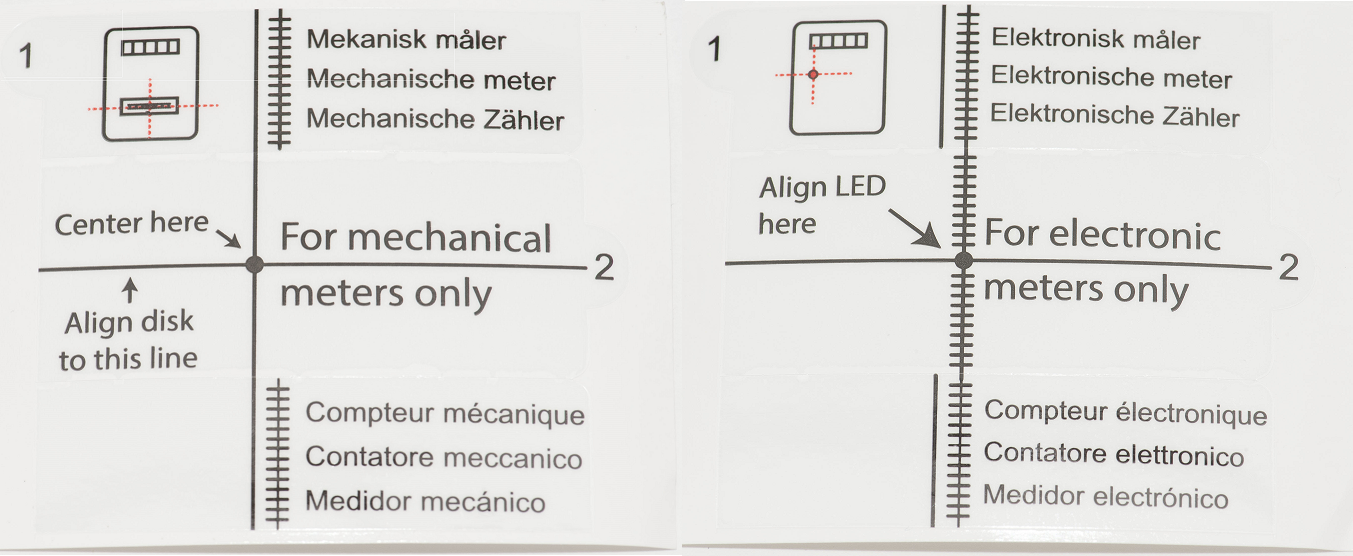 Start, by removing the template from the white background, by gently pulling slip 1 on the lefthand corner of the template. The template should be placed above the LED on the power meter, where the horizontal line and the right-hand-side vertical line cross. When the template is in place, you should carefully pull slip 2 in order to remove the middle section of the template. You can now position the sensor head on the meter. The sensor head should be placed in the middle of the template, so that the two vertical lines on the template, line up with the same lines that are etched into the surface of the sensor head. Remove the two pieces of red plastic that cover the adhesive pads on the front of the sensor head, and then attach the sensor head onto the meter.
