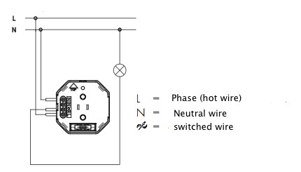 The schematics below shows how to wire the actuator. The two wired from the mains distribution panel are connected to the inserts contacts N and L. The contact S is the switched contact and need to be connected to the cable to the load. The second wire to the load is connected to N as well. Both contacts marked as N are connected with each other.