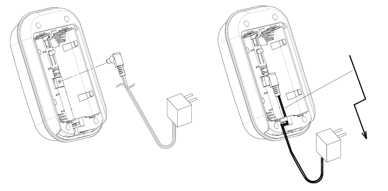 3. You can use power adapter instead of batteries. The power adapter is an optional accessory. A cable track is set inside the unit for you to secure the power adapter. To install the power adapter, connect the plug of power adapter to the DC jack inside the unit. Route the cable along the cable track.