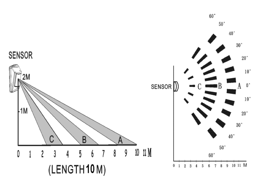 3. Using the adhesive tape to mount the device about 2 m above surface. To enhance operation place the device on a position which can detect the room widely. See figure below. The solid areas are the areas monitored.