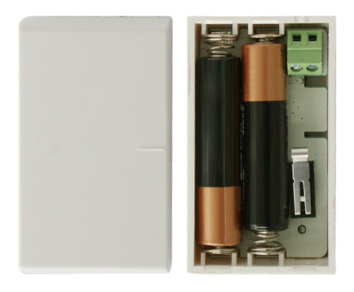 This battery operated device combines a temperature sensor with a binary sensor using dry input connectors. Both sensor functions can be used independently. The device has a tampering protection switch that is suited for applications where the dry inputs are used for security related application. The binary sensor is issuing a wireless command whenever the connection is closed or opened. The temperature sensor needs to be polled in order to get its value. The device is IP 20 rated and can be used in dry environments only. The precision of the temperature sensor is in the range of +/- 1 °C