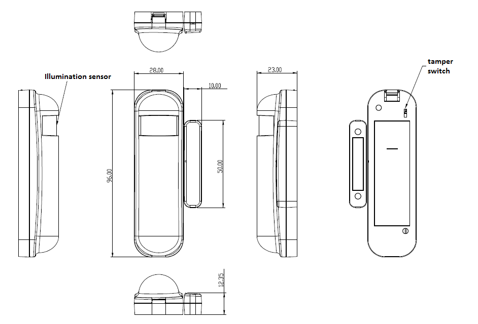 Every time the Door/Window triggers, the sensor will also send temperature and illumination value as well. After powering up the divice needs several minutes to setup and work properly. The device has a tamper switch, which starts alarm when the device is forcibly removed.