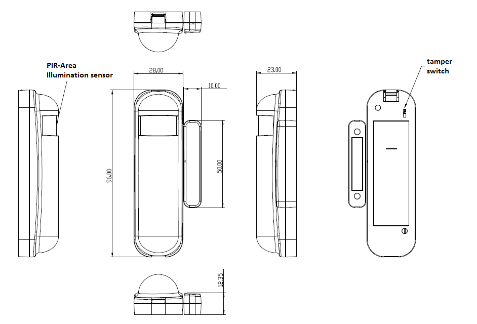 The detector can be used as a security device or home automation device. When the detector is cooperated with security appliances, the (1) Door/window or (2) PIR sensor act as an alarm detector. Alternatively, when the detector is worked with Z-Wave controller, the detector can be set to perform the role of home automation device by detecting both changes in PIR motion detect or door/window open close signal with percentage of illumination lux levels.