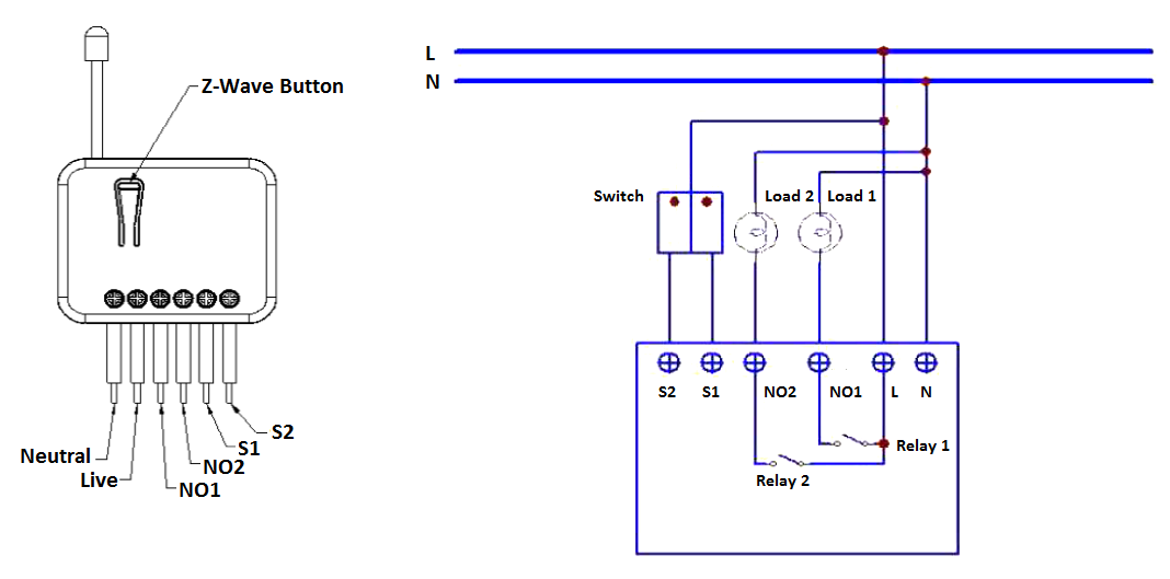This Insert Switch allows controlling two independent loads both wirelessly via Z-Wave and locally utilizing a traditional wall switch. Thanks to its calibration technology the device cannot only be used to switch resistive devices but also works perfectly with many kind of reactive or resistive loads such as fluorescent lights or LEDs. This insert switch module has a power meter function and is able to measure instant power, voltage, current, power factor and accumulated power consumption. In addition to this, the device has an overload protection. The device is placed in a wall box right behind the normal switch. The switch is not longer directly connected to the load but acts as input device for the insert that is controlling the load. This device is designed for a 3 wire system and needs a neutral wire in the wall box.