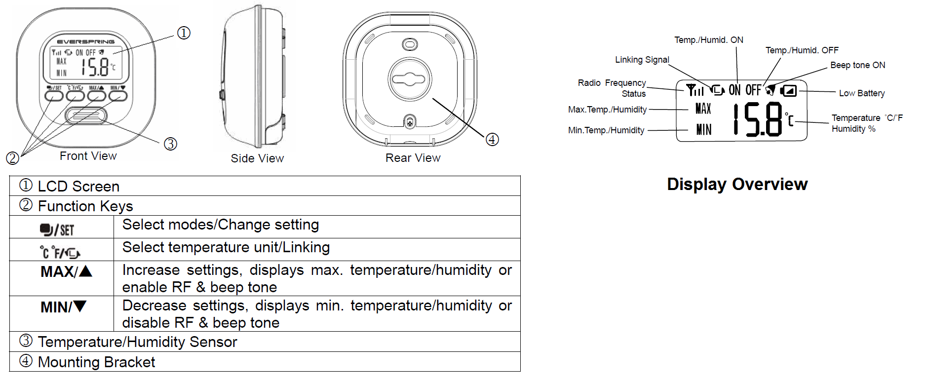 The humidity ranges from 20% RH to 90% RH. To show the last record of max/min humidity, press Min. or Max. button. To clear the record, press both Min. and Max. button at the same time.