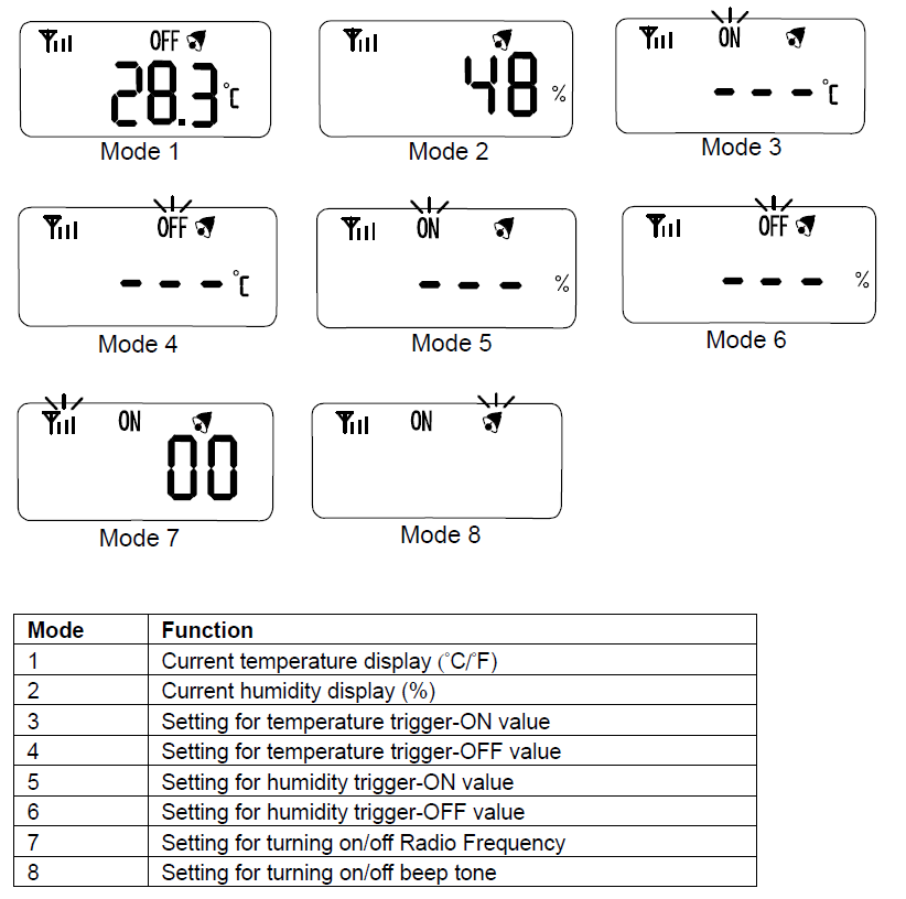 If the temperature reaches the preset trigger-OFF value, Temp./Humid. Detector will send a Z-Wave signal. The screen of detector returns to MODE 1 and the icon is flashing with backlight illumination and siganl tone sounds for 1 second. Press any key to stop the siganl tone.