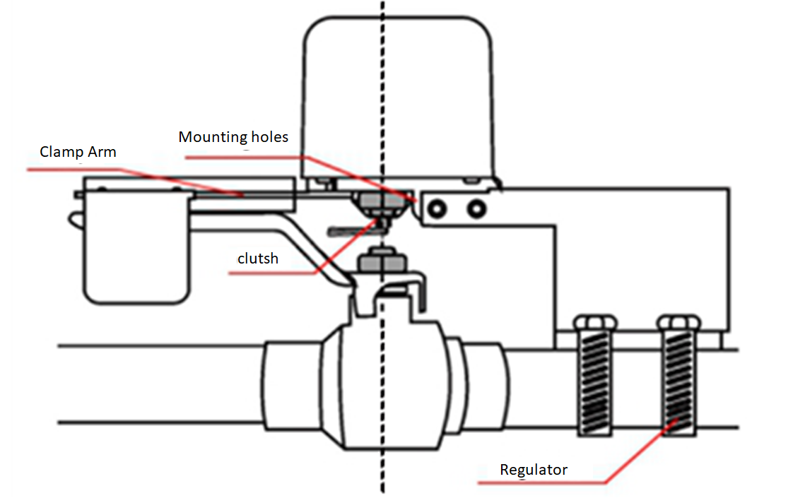 1. Mount the Popp Flow Stop 2 on the ball valve using the mounting bracket and the pipe clamps that surround the pipe and fix the motor to the connection hole.
