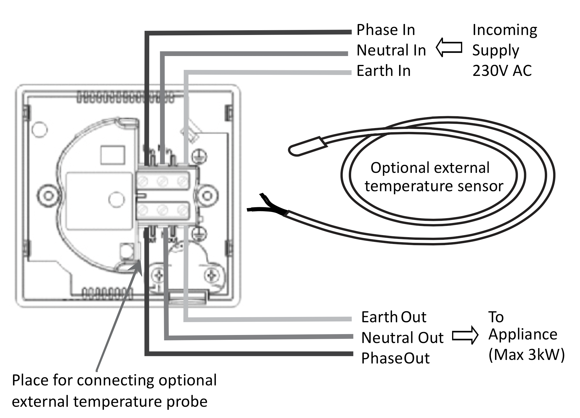 All un-insulated earth conductors must be sleeved and connected to the earth terminals on the back of the SIR. The supply earth conductor and appliance earth conductor must use the separate terminal connections provided. Switch off the mains supply and then connect the conductors for the incoming supply and the appliance on the back of the unit, as shown on the next page. Connect the two leads from the optional external temperature sensor probe (if supplied) to ‘H4’ and ‘1’ marked terminal. The probe wires do not have any polarity.