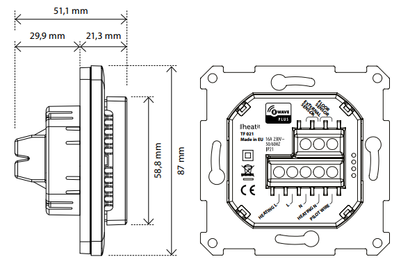 Heatit Z-Wave is an electronic thermostat for mounting in a standard wall box. The thermostat has a built-in Z-Wave chip that can be connected to Home Automation systems like Fibaro, Sensio, Vera, Zipato and others.