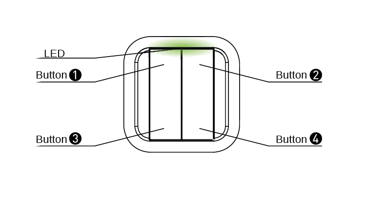 | 5 | 8 | Button 4 - MONO - Controlled nodes. - A short press will activate (ON) your associated devices - A second short press will deactivate (OFF) your associated devices. If some of the associated devices have dimming features (light dimmer, roller shutter, etc.): - A long press will dim up your associated devices (light, roller shutter, etc.) until you release the button - A second long press on the same button will dim down your associated devices (light, roller shutter, etc.) until you release the button. |