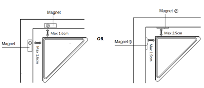 3. The magnet and the main sensor must be less than 1.6cm apart for the small magnet installation or 2.5cm apart for the big magnet installation. Main sensor must be affixed to the door or window and the magnet must be affixed to the frame. The magnet and the main sensor must separate when the door or window is opened.