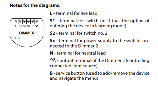 NOTE: Switch connected to the S1 terminal is a master switch. It activates the basic functionality of the Dimmer 2 (turning the light on/off, dimming) and starts the learning mode (Add/Remove). The switch connected to the S2 terminal is an optional switch and pushing it without changing the configuration parameters will not affect the status of the device. Functionality of the switches can be reversed by adjusting advanced parameter.