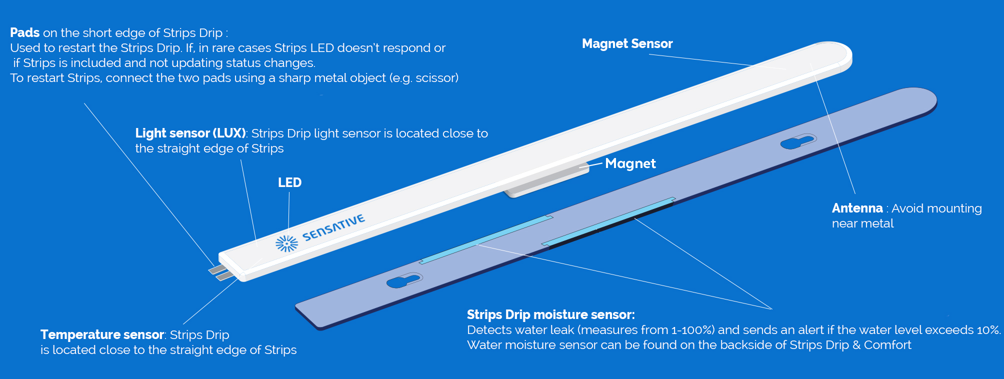 Strip Drip sends an alarm signal if it detects a water leak. Its unique design allows it to be easily placed almost everywhere, including most places other sensors simply can?t fit. With soaking pads integrated in the mounting plate even small amounts of water will be detected. The built-in temperature sensor gives the possibility to combine the leakage alarm with a freeze alarm. There is also a built-in ambient light sensor that may be useful in special applications.