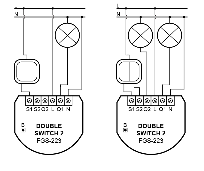 Switch connected to the S1 terminal is a master switch. It activates the basic functionality of the device (turning the first load on/off) and activates the learning mode (adding/removing). The switch connected to the S2 terminal turns on/of the second load in Double Switch 2, but is optional in Single Switch 2 and pushing it will not affect the status of the device.