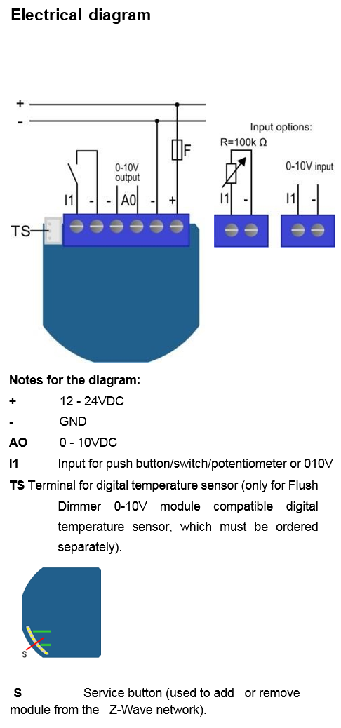 Universal dimmer module with a standard 0-10V output and a multi-function input, which may be a push button / switch, a potentiometer or 0-10V signal.