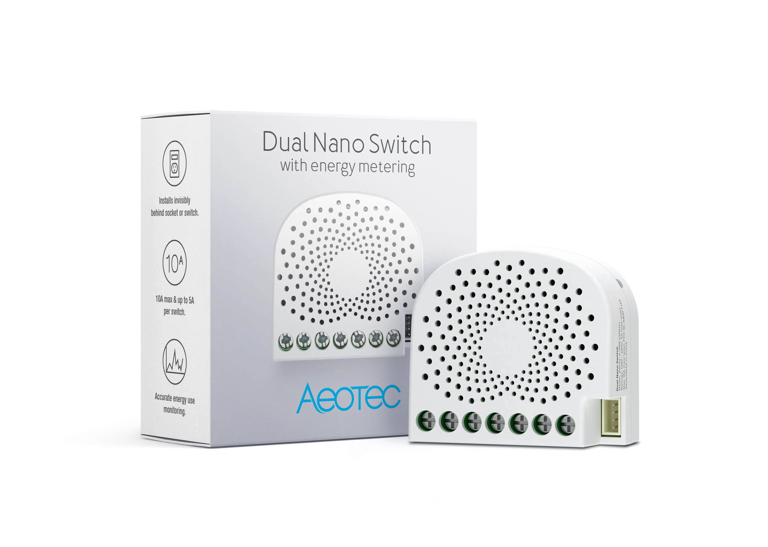 Aeotec Dual Nano Switch is a Z-Wave Smart Switch specifically used to enable Z-Wave command and control (on/off) of any wall switches. It can report immediate wattage consumption or kWh energy usage over a period of time. In the event of power failure, non-volatile memory retains all programmed information relating to the units operating status. It can connect to 2 external manual switches to control the load ON/OFF independently. Its surface has a pin socket, which can be used for connecting to the touch panel, so you can also use the touch panel to control the Dual Nano Switch. The Dual Nano Switch is also a security Z-Wave device and supports Over The Air (OTA) feature for the products firmware upgrade.