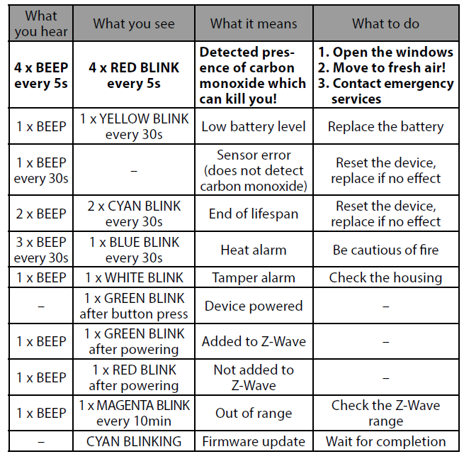 | 6 | 5 | CO Alarm BC - is assigned to the device status - devices in this group will be switched on/off when CO Alarm status changes. Provides backward compatibility with controllers not supporting Z-Wave+ protocol. |