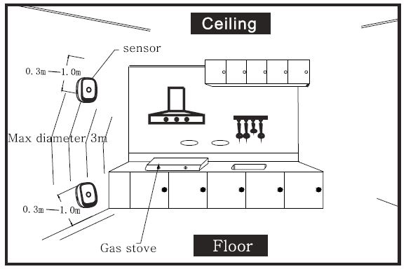 Liquefied petroleum gas should be isntalled at 0.3-1m height from floor and semi-conductor of sensor installation position to gas source should be less than 1.5m. Natural gas, manufactured gas, marsh gas, etc. should be be installed at 0.3-1m bellow from ceiling, semi-diameter to gas source less than 1.5m.