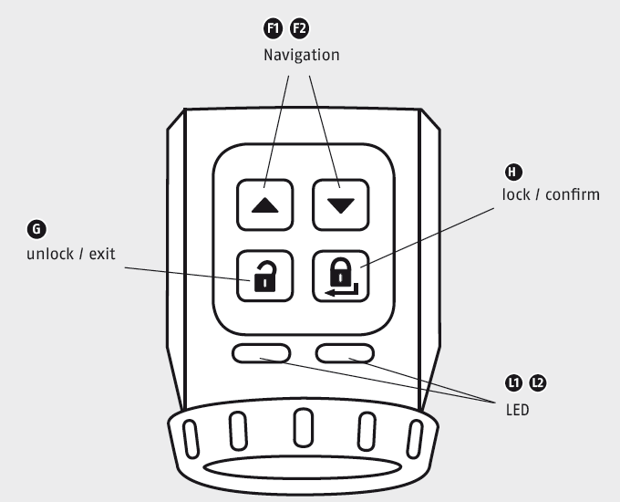 - Move in this menu by pushing F1 or F2 Arrows. The left LED will change its color to indicate different menu items.