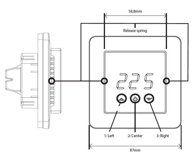 When the thermostat remains untouched for a while, it will automatically revert to the standby screen. The standby screen will by default show the setpoint temperature. By pressing any button once, you will see the measured temperature. By pressing the left or right (up or down) button one more time, you will change the setpoint.