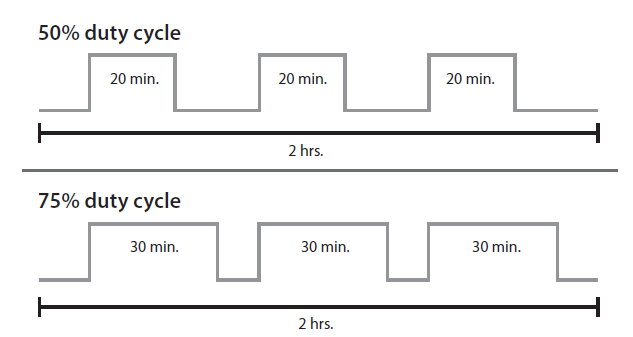If you have a set point of 20°C, the thermostat will use the full power until the temperature is 19°C. The thermostat will then begin to regulate the output from 19°C with a 75% duty cycle until it reaches 19,25°C. When the temperature has reached 19.5°C the thermostat will use a 50% duty cycle, until it reaches 20°C, then the thermostat turns off and repeats the process. For example, at a 75% duty cycle it will turn ON for a total of 90 minutes and OFF for 30 minutes.