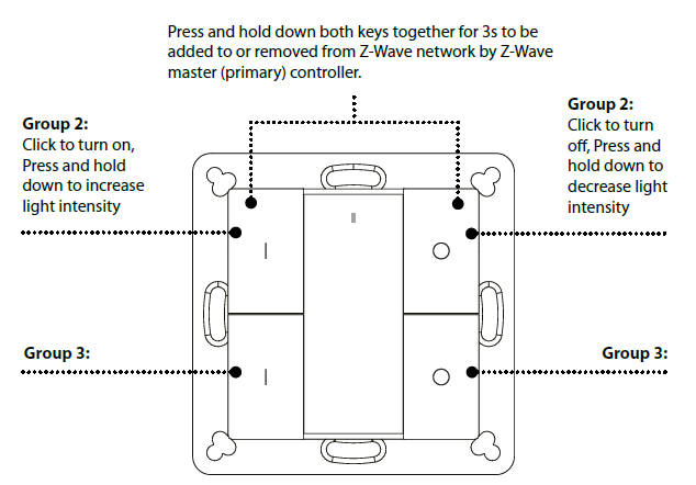 1. Control of groups of other Z-Wave devices using ON, OFF and Dim commands.
