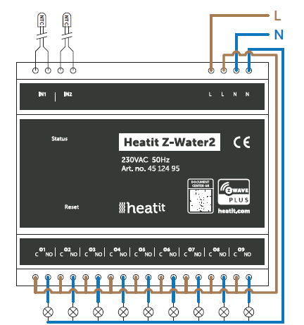 The Heatit Z-Water2 relays may be controlled by associations with other Z-Wave thermostats e.g Heatit. Each relay can control one or several actuators in your underfloor heating system.