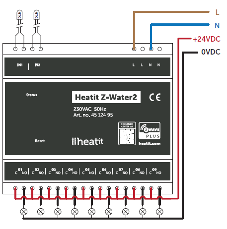 Heatit Z-Water2 is equipped with 9 potential free relays for actuators. It also has 2 analog inputs for temperature sensors.