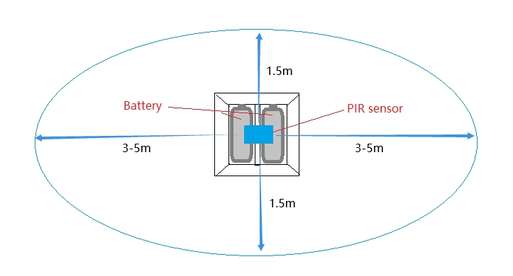 The longer detection range of the motion sensor is in the direction of the side of the battery.