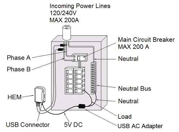 The HEM can be placed on every dry place closed to the electric installation to be monitored. The current transformers need to be clamped around single wires. Attention: It is not possible to measure the current in cables that consist of more than one wire. Such a wire must be stripped and the CT has to be installed on the hot wire only. If there are less wires than the number of CTs this will not harm the operation of the device.