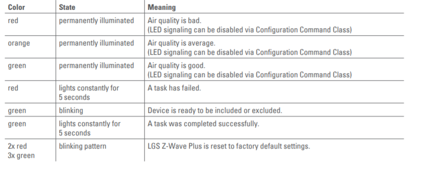 | Reset to factory default | Press and hold the network button for at least 10 seconds. The Air Quality Sensor Z-Wave Plus will indicate the reset blinking pattern once the reset is completed. |