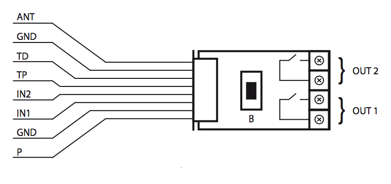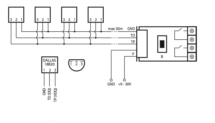 The external temperature sensors DS18B20 are connected to the device as shown on this picture. The subsequent image shows how to connect such an external switch or an external sensor to the terminals.