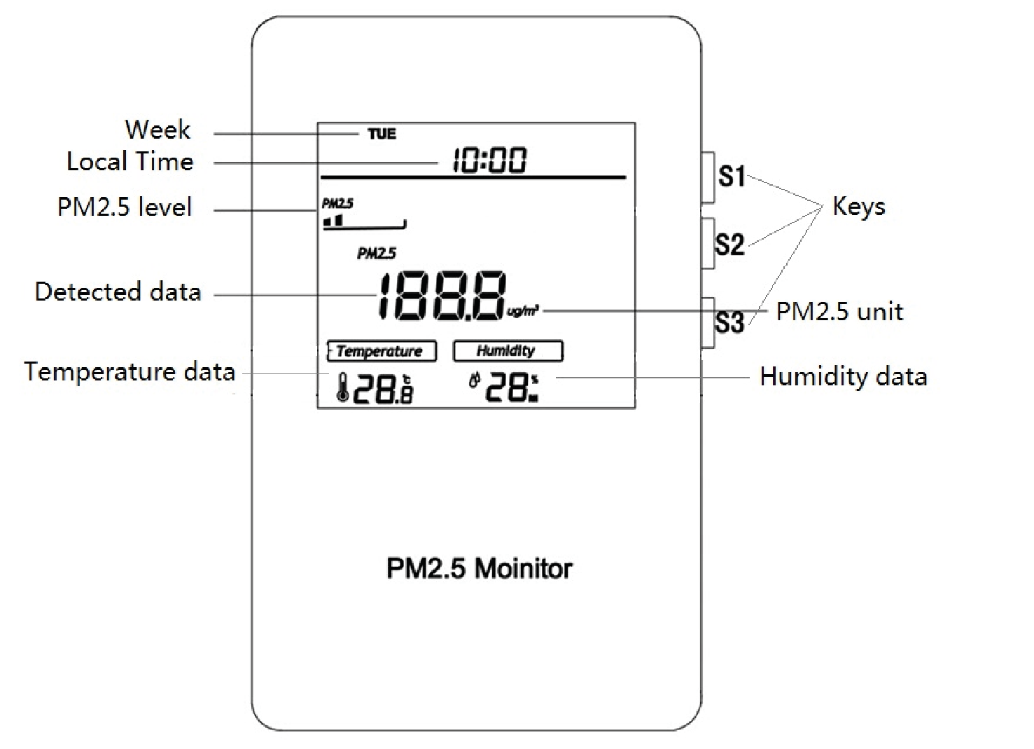 In normal display interface, long press S3 will enter the local time modification interface. Press S2 can switch among "Week, Hour and Minute ", press S1 or S3 can change their values. After all parameters set, press S2 can save settings and return to normal display.