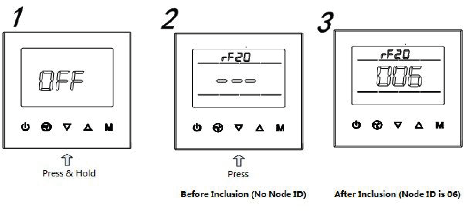 Under the shutdown state, press and hold down arrow to enter interface for inclusion or exclusion of Z-Wave network. Before device included into network, (- - -) will display on the screen. Then press down arrow once, device will enter learning mode to get a node ID. If inclusion is success, a node ID will display on the screen in a few seconds. A node ID can always inform us whether the device is in the network or not. Note: Follow the same steps to exclude the device from the network. After inclusion, turn off the device and then turn it on. Now the device is ready to be operated by controller/ gateway in Z-Wave network.