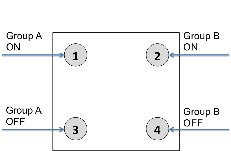 4 Groups are controlled with single button (parameter 1/2 = 0) The four buttons 1-4 control one single control group each: 1->A, 2->B, 3->C, 4->D. Single click turns devices in the control group on, double click turns them off. Click and hold can be used for dimming.